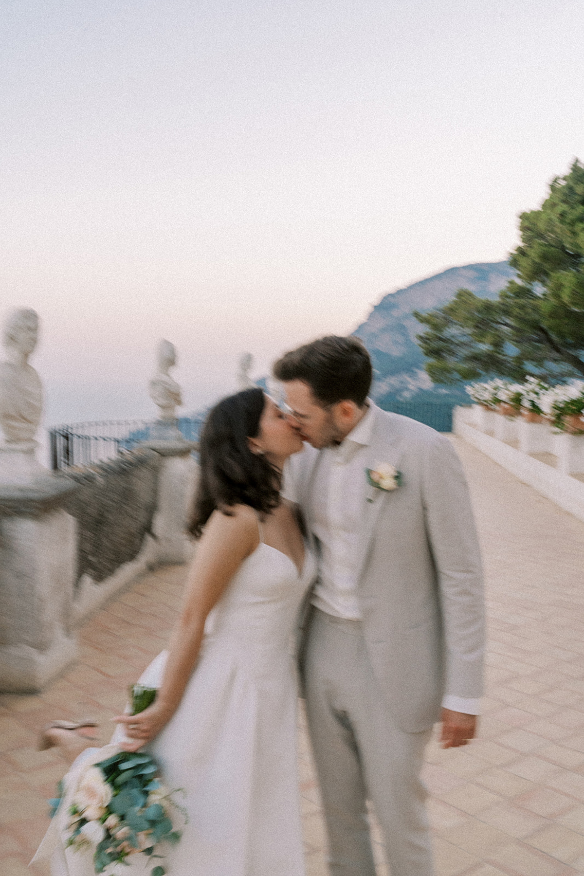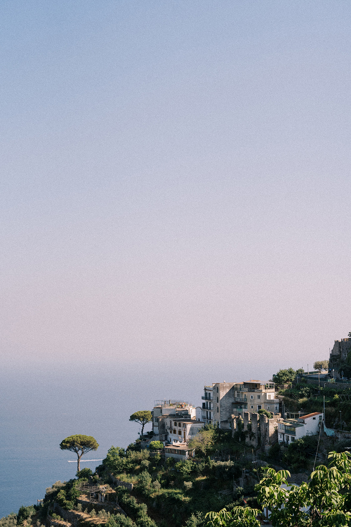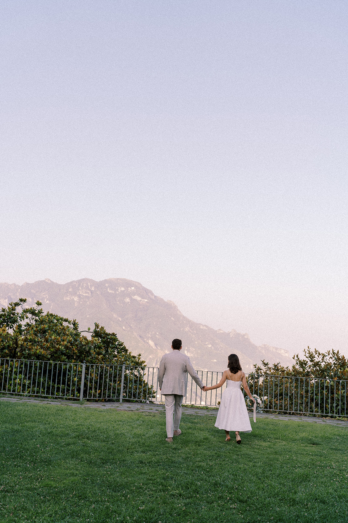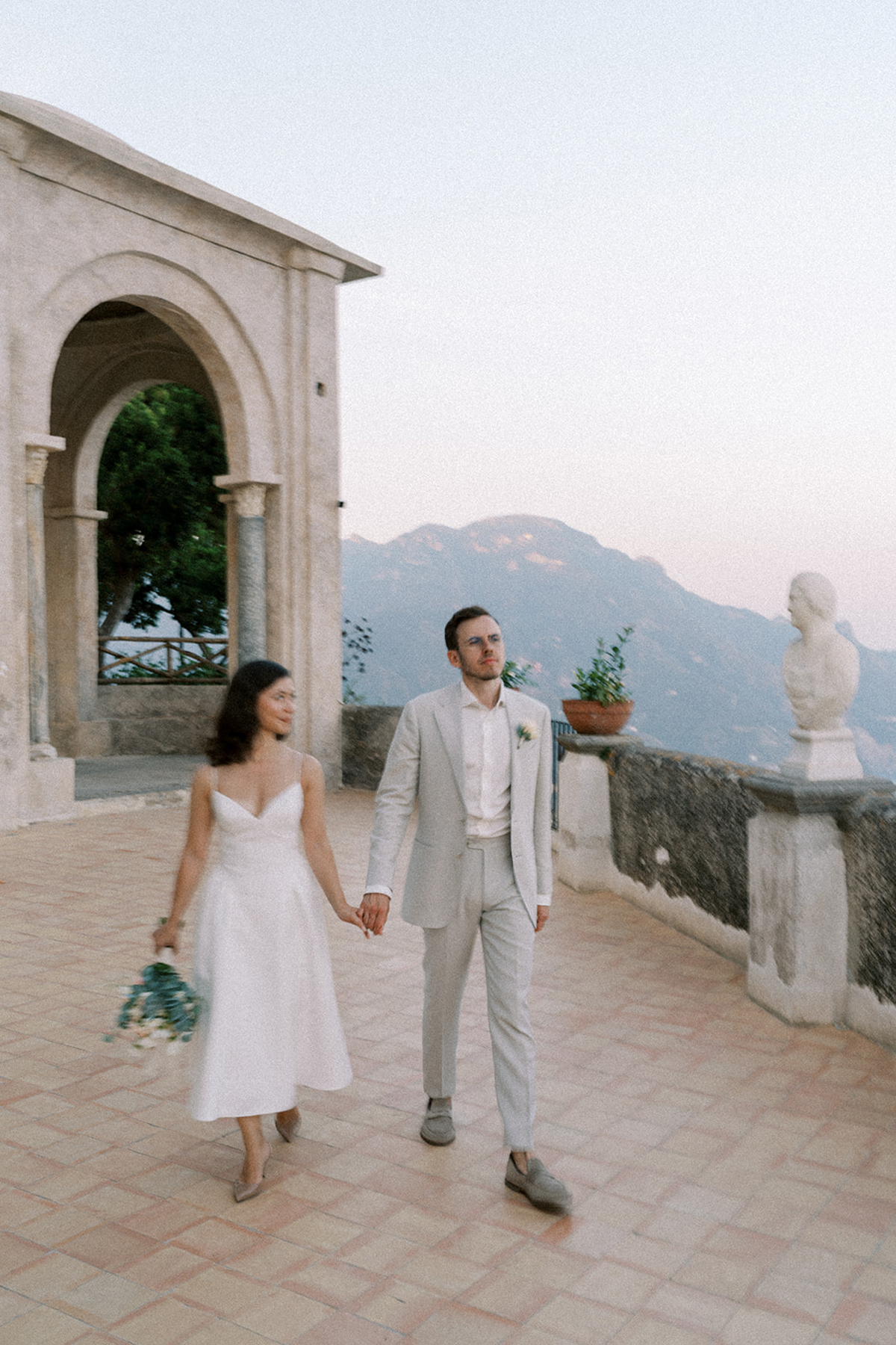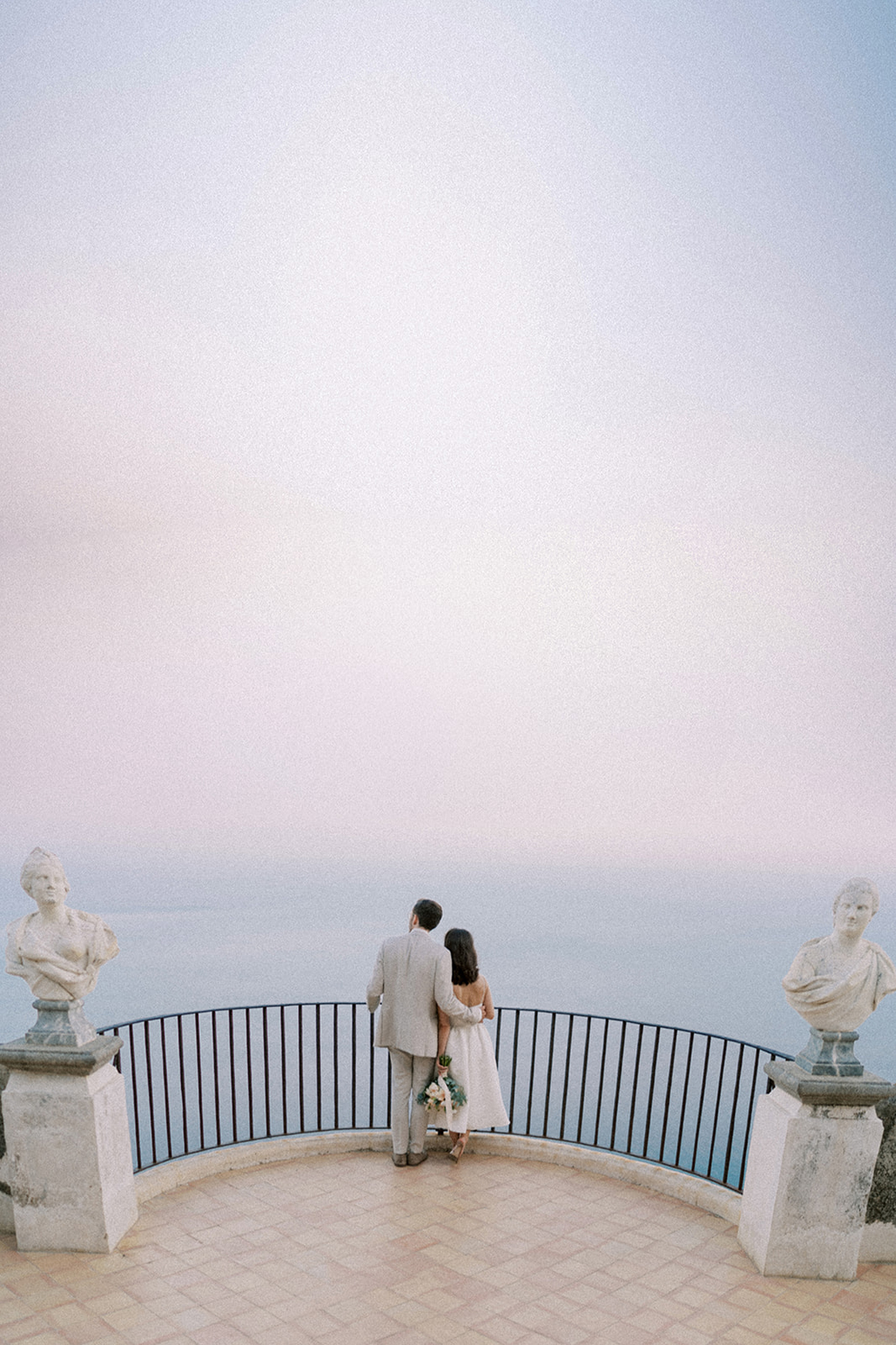 Começámos no elegante Palazzo Avino, onde a luz suave da tarde entrava pelas janelas e tudo parecia suspenso no tempo. No jardim dos Giardini Principessa di Piemonte, o casal trocou votos em silêncio, rodeado apenas pela brisa e pelo som distante do mar.