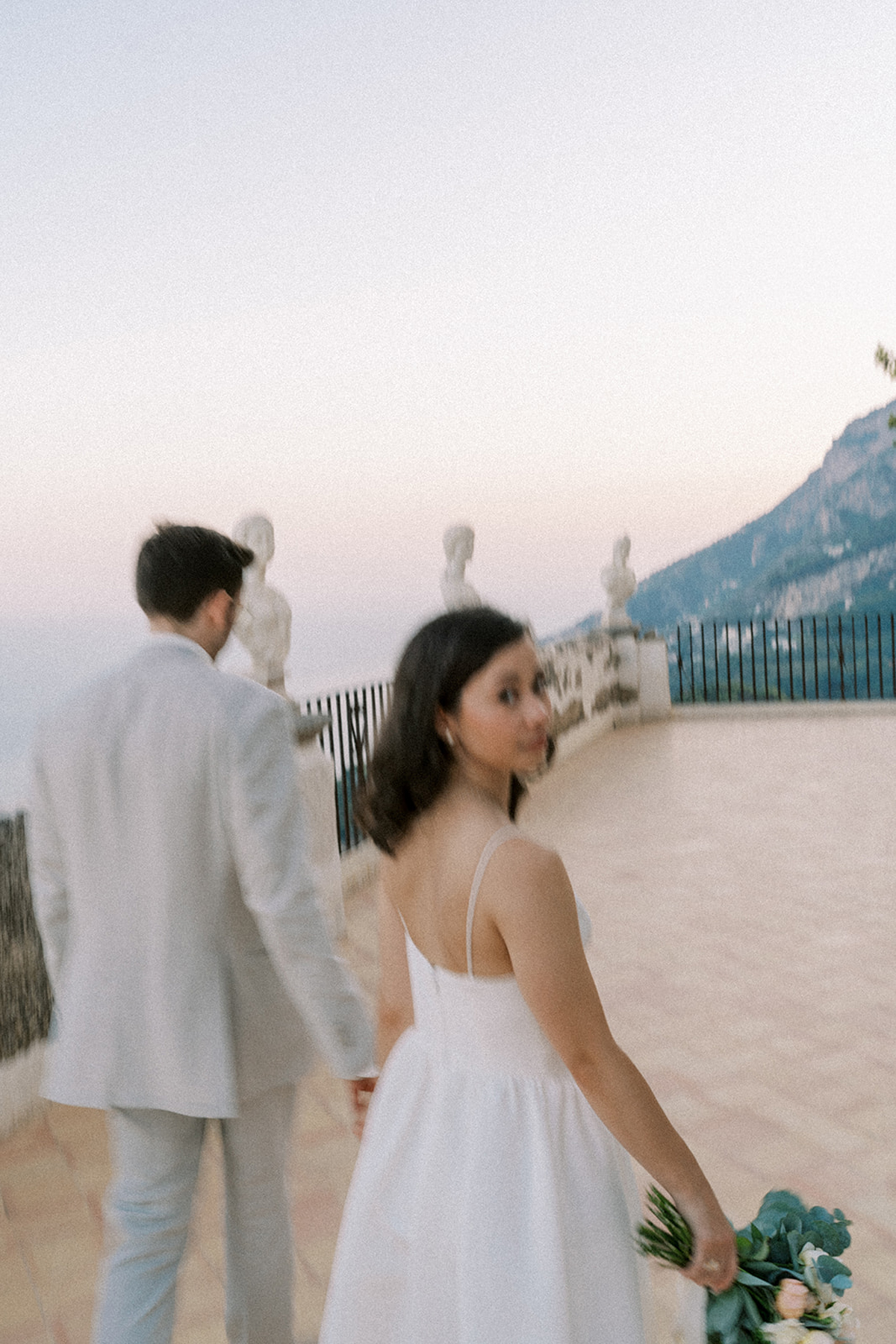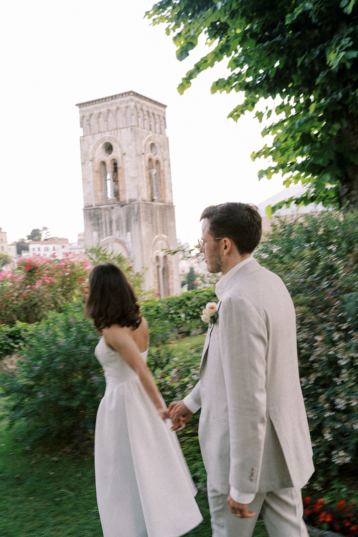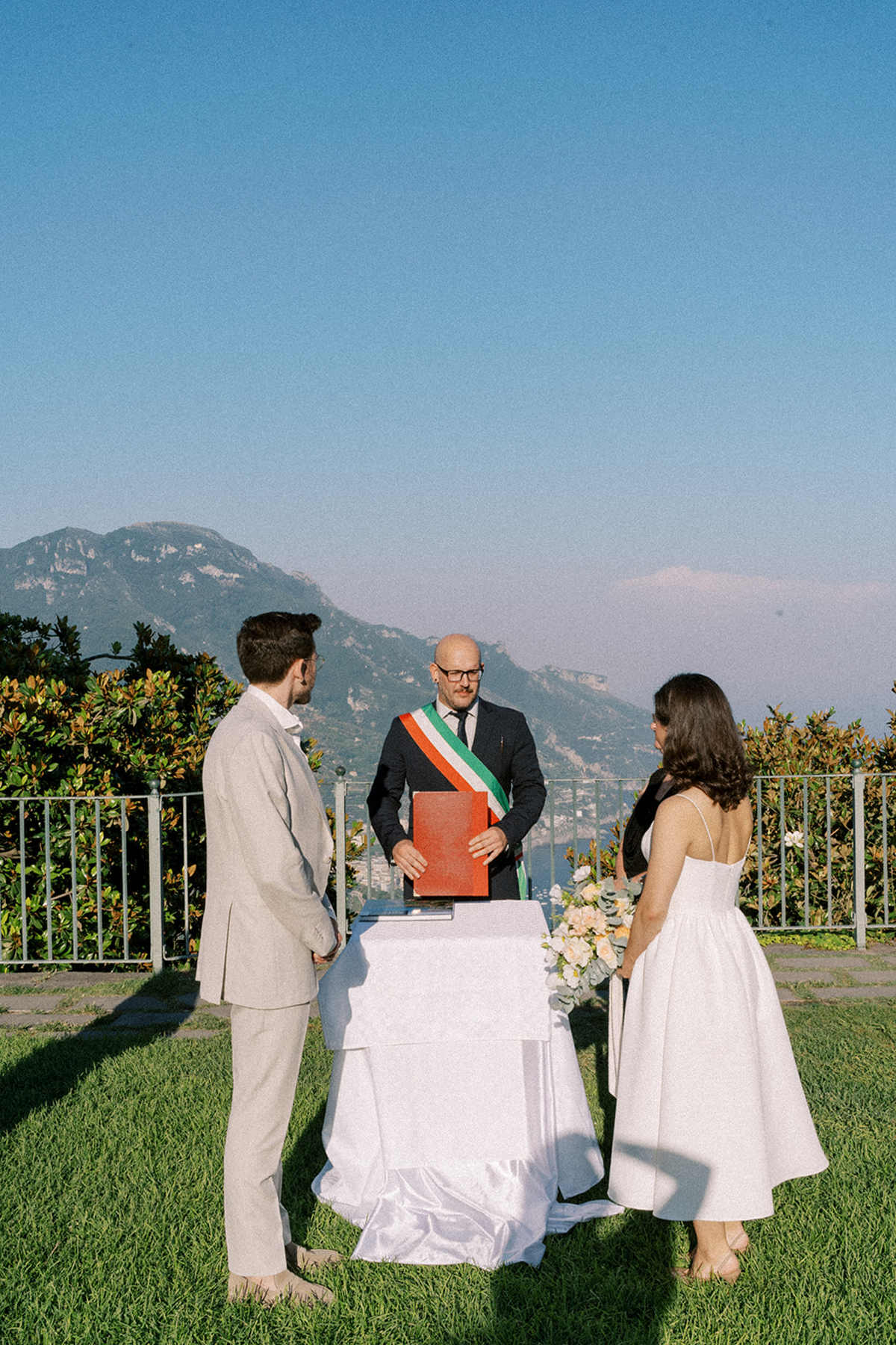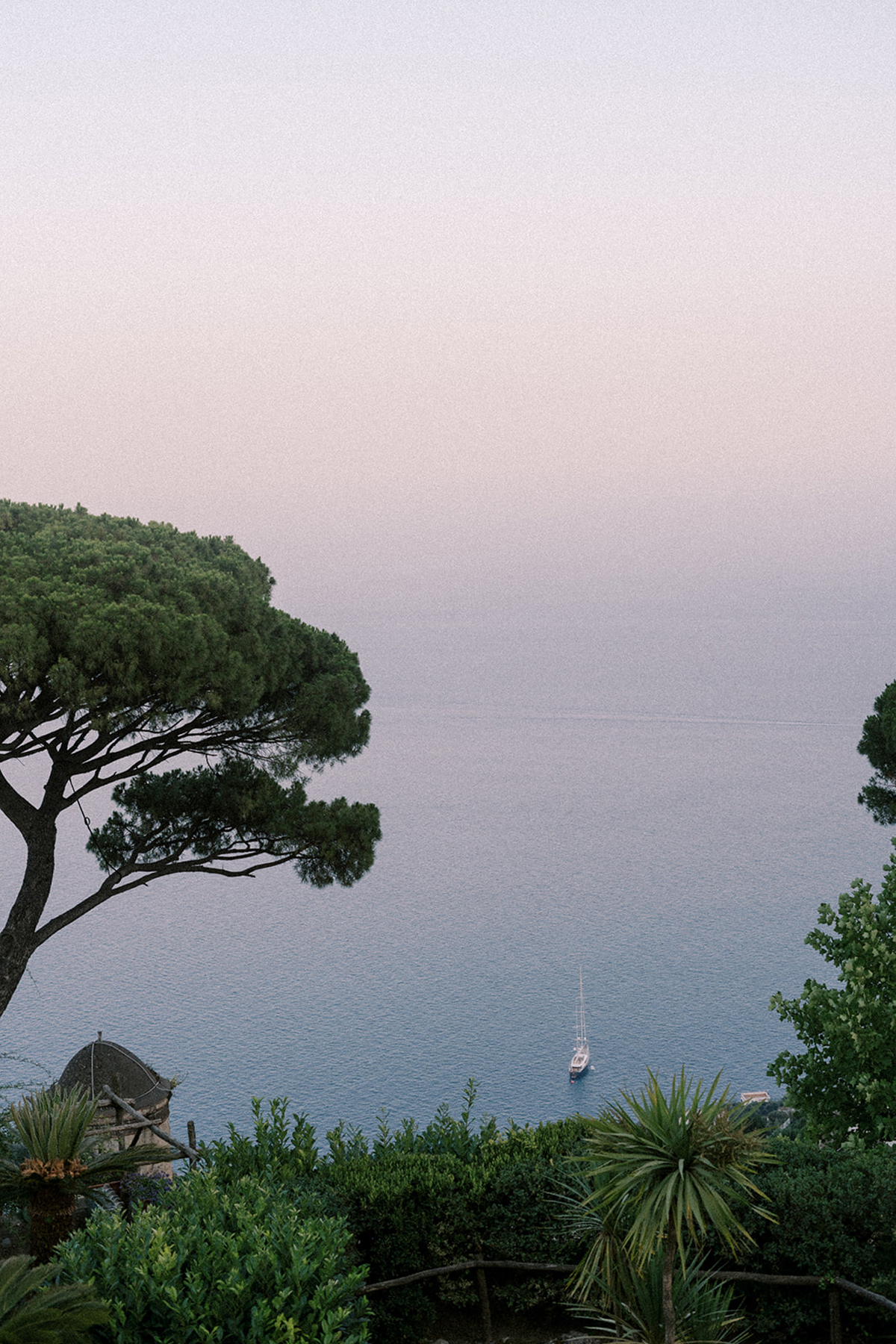 Começámos no elegante Palazzo Avino, onde a luz suave da tarde entrava pelas janelas e tudo parecia suspenso no tempo. No jardim dos Giardini Principessa di Piemonte, o casal trocou votos em silêncio, rodeado apenas pela brisa e pelo som distante do mar.