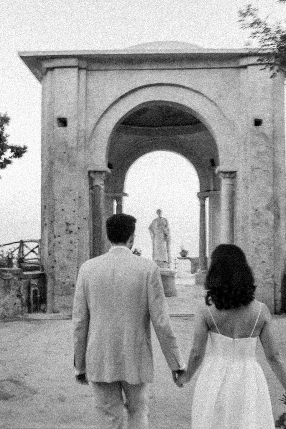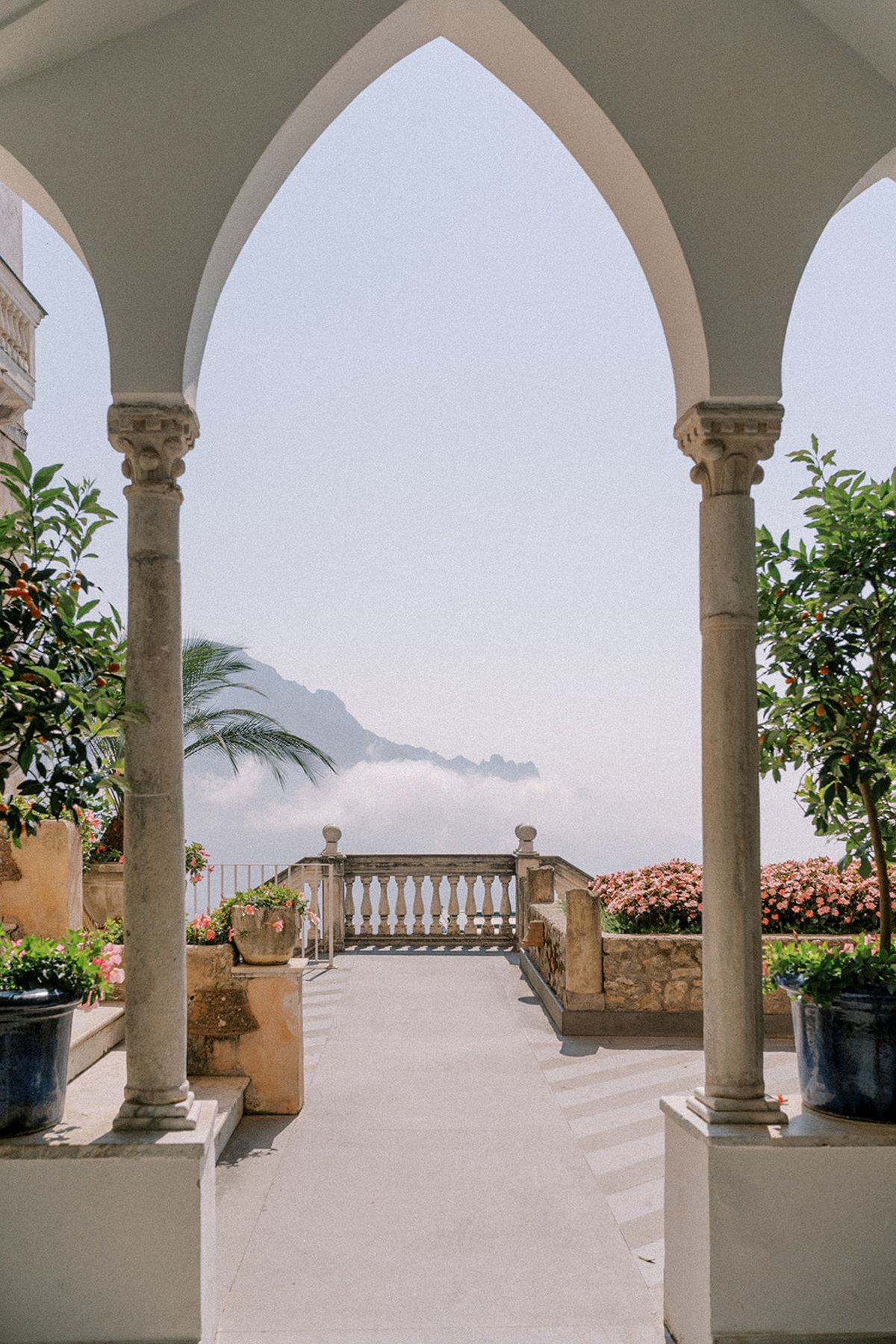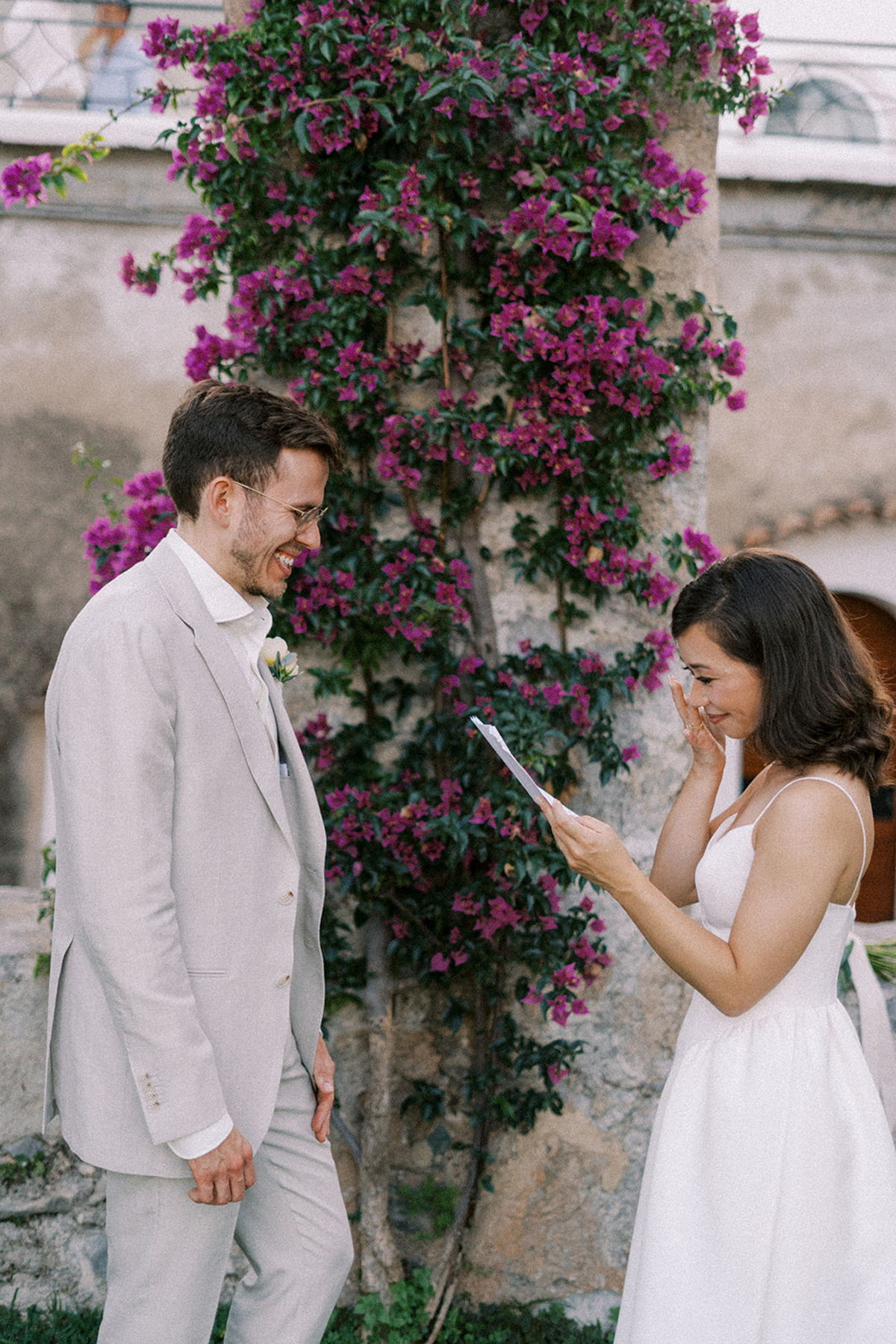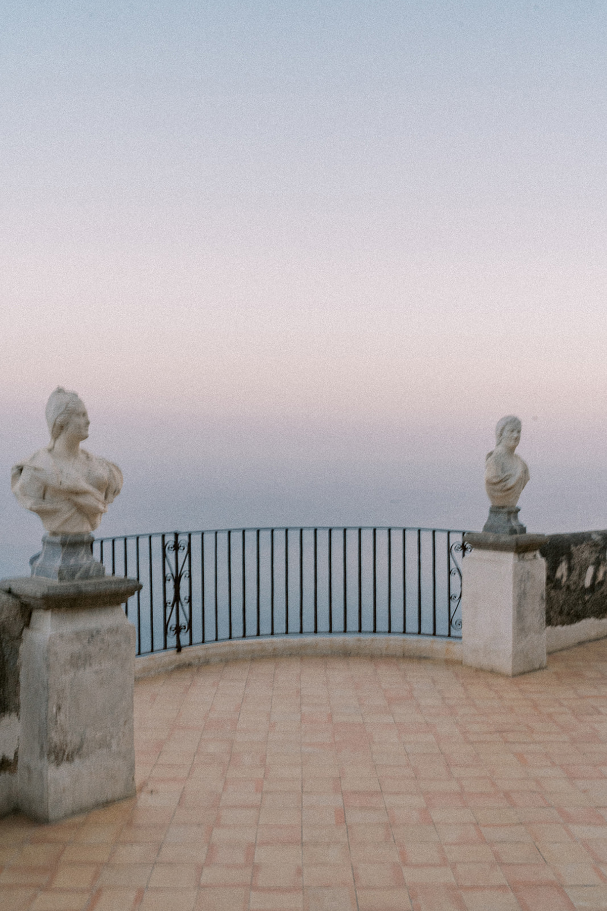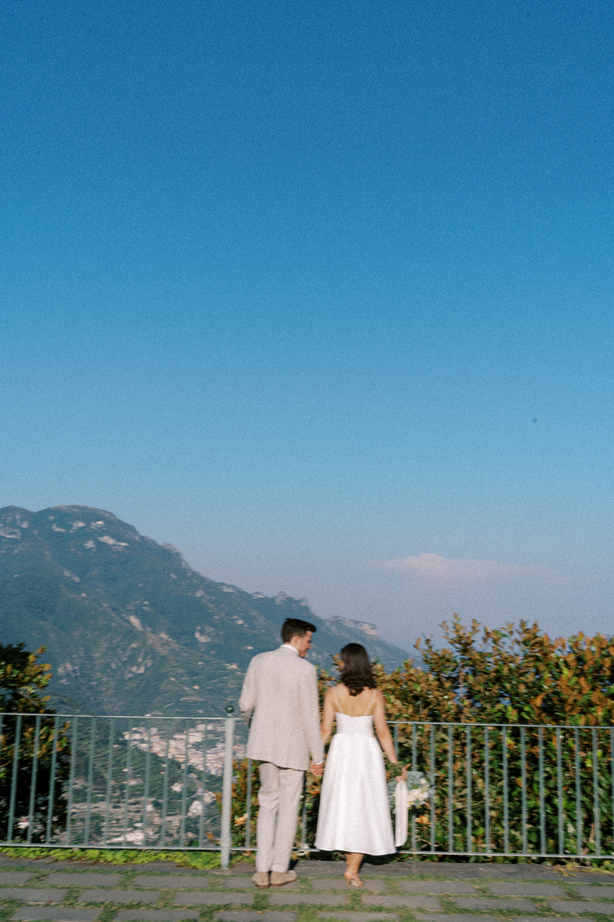 Começámos no elegante Palazzo Avino, onde a luz suave da tarde entrava pelas janelas e tudo parecia suspenso no tempo. No jardim dos Giardini Principessa di Piemonte, o casal trocou votos em silêncio, rodeado apenas pela brisa e pelo som distante do mar.
